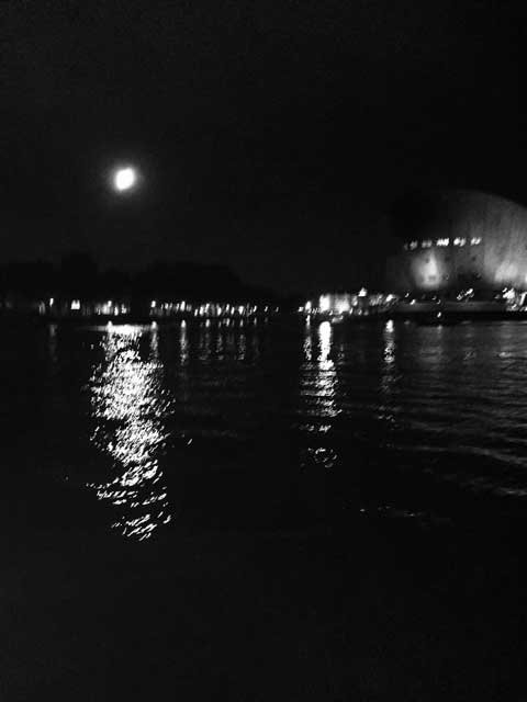After dinner, we disembarked the ship in search of an Amsterdam experience…which came in the form of a waterside drinking establishment that had the look and feel of a pop-up, impromptu tavern. Crowded, there was no seating to be had in the ramshackle building, so we made like a Mokumer (“When in Amsterdam…”) and found a spot on the ground outside. Dangling our legs over the water, we sipped on our first native brew of this vacation under strings of multi-hued holiday lights and surrounded by the youth of Amsterdam who lounged on any available spot of land or bobbed dockside in questionable watercraft as the sun set and the moon rose.