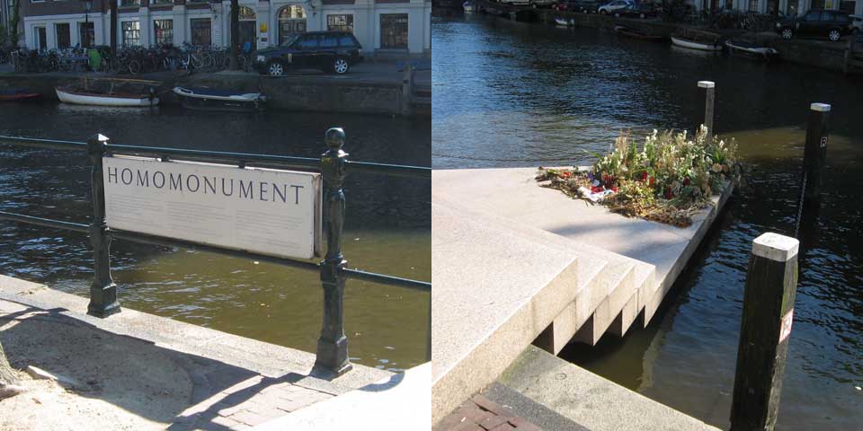 Down the street from the Anne Frank house is another memorial to victims of Nazi persecution: gays and lesbians. Based on the pink triangle, the design is a composition of triangles within triangles. There are three separate spaces–a raised pink marble triangle, a ground-level embossed triangle and a step-down triangle that protrudes into the adjacent canal (above). Each of these form the three points of one overall triangle that dominates the plaza.