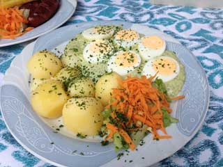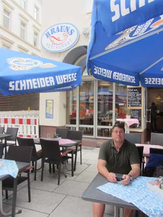 After grocery shopping, we found a little sidewalk cafe and shared two luncheon entrees: one comprised of sausages and pomme frits (french fries) and the other consisted of fried potatoes and hard-boiled egg halves in a regional green sauce. Naturally, it was accompanied by some good, hearty German beer. Yum!