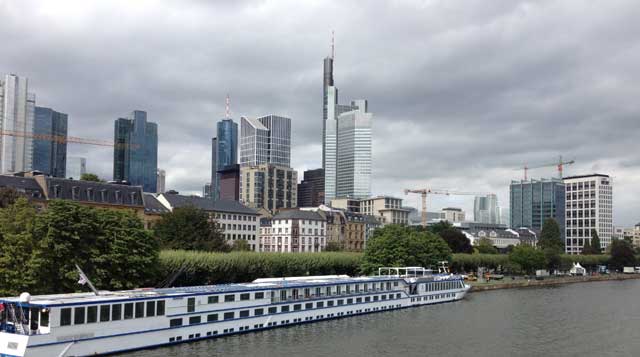 There’s a fabled story of how Frankfurt got its name. The man in the foreground with the shield is a Frank. His enemies are behind him. On the shore of the Main (am Main), he watched and waited until two deer used a ford (furt) hidden beneath the water’s surface to cross the river. Using the same route, he moved his forces across to safety, leaving his enemy befuddled on the opposite bank. Voilá! Frankfurt am Main.