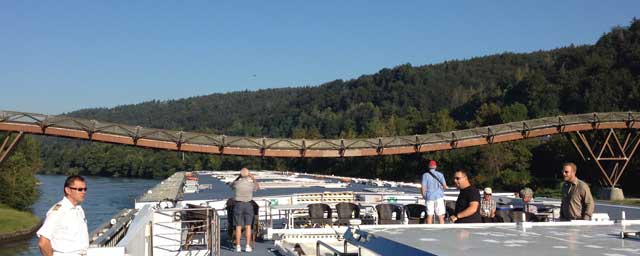 Good wheat beer–Rob & I each had two–and the pretzel was, well, Bavarian and thus of equally high quality. Then back to the boat for lunch and launch.