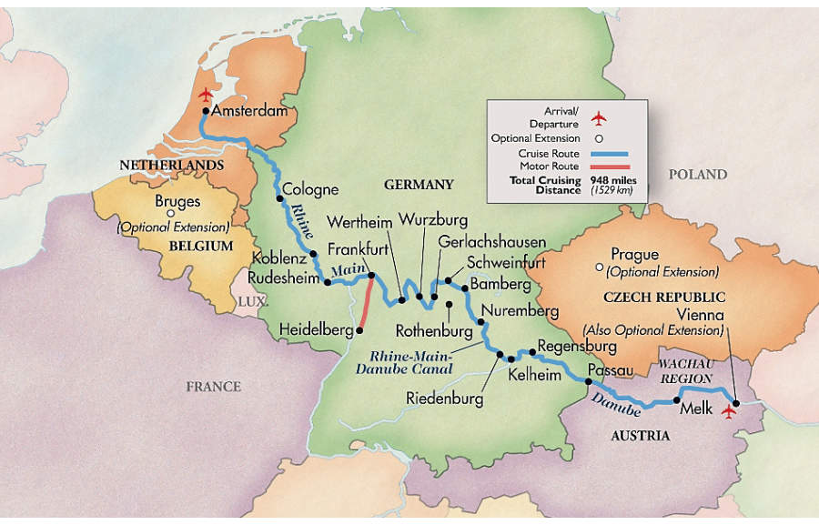 Below is a map of the three Great Rivers of Europe (the Rhine, the Main and the Danube) we will (water-level permitting) be cruising. Starting in Amsterdam, we will disembark in Vienna sixteen days later.
